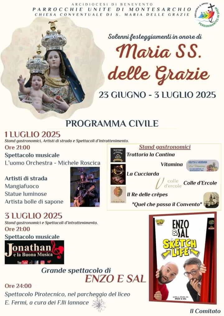 Le Parrocchie Unite organizzano i Solenni Festeggiamenti in onore di SS. Maria delle Grazie, dal 23 Giugno al 3 Luglio, a Montesarchio in provincia di Benevento. Il Programma civile dal 1 al 3 Luglio 2025. Si ringrazia Giuseppina P. per la segnalazione
